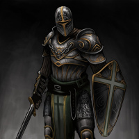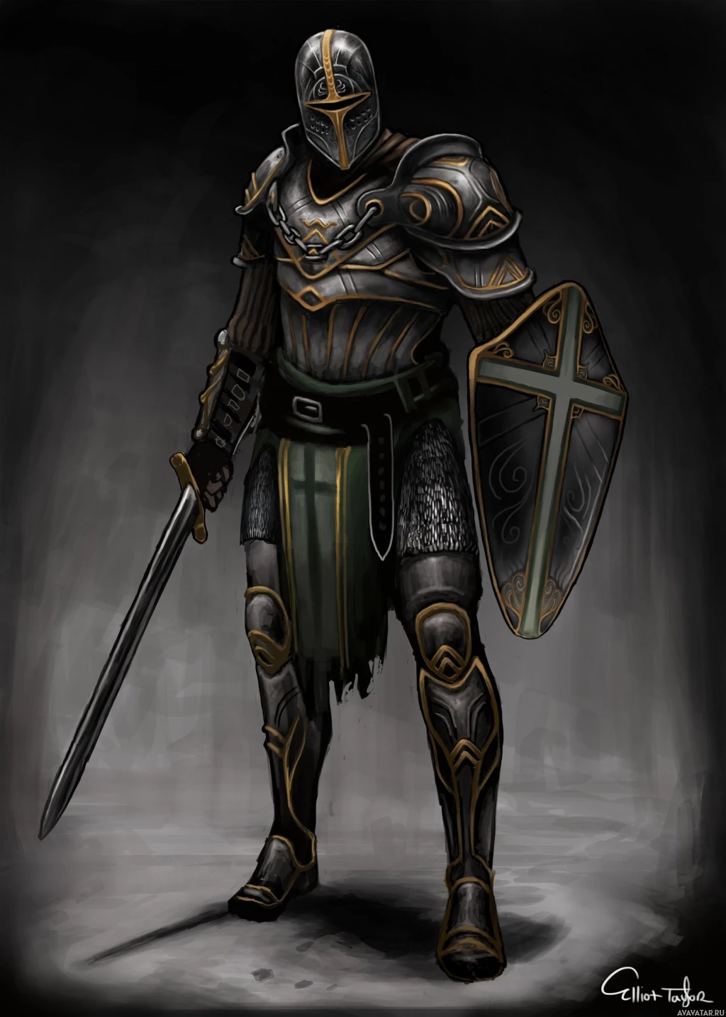 shades of grey and black, which contrasts with the brightness of the armor, making the knight stand out as the central figure in the image.