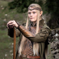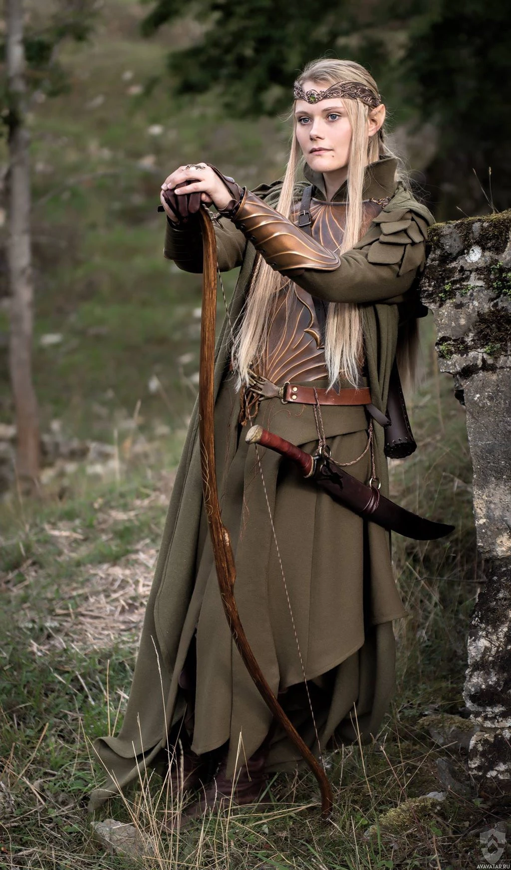 mythical being. They are holding a bow and arrow, which suggests they may be portraying a character from a storyline involving archery or hunting. The setting appears to be outdoors with natural elements like foliage, indicating that the scene might be from a fantasy-themed photoshoot or event. The attire, including the cloak and headpiece, gives off an elvish vibe commonly associated with