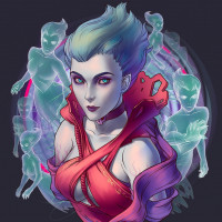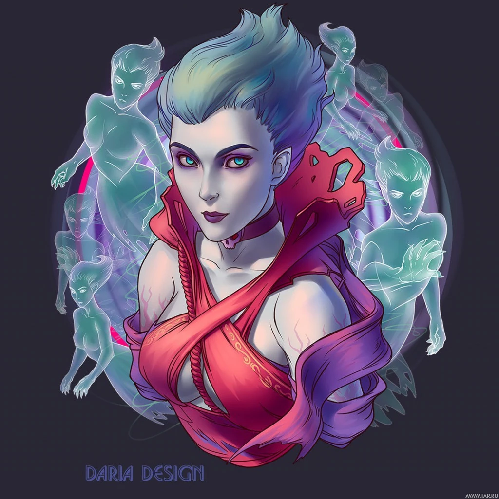 a character from the game Dota 2, known as Death Prophet. This character is depicted in a stylized form with various magical or spectral elements surrounding her head and body, which could be interpreted as