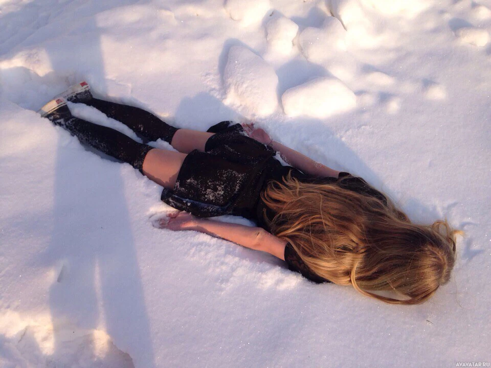 The picture shows a person lying on their stomach in the snow. It appears that the individual is wearing