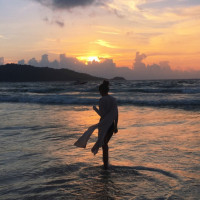 The image shows a silhouette of a person from behind, standing on the beach during sunset. The sky is lit with hues of orange and pink, indicating that it's either dawn or dusk. The water appears calm, reflecting the warm colors of the sunset. The girl in the image seems to be enjoying the peaceful moment alone by the seaside.