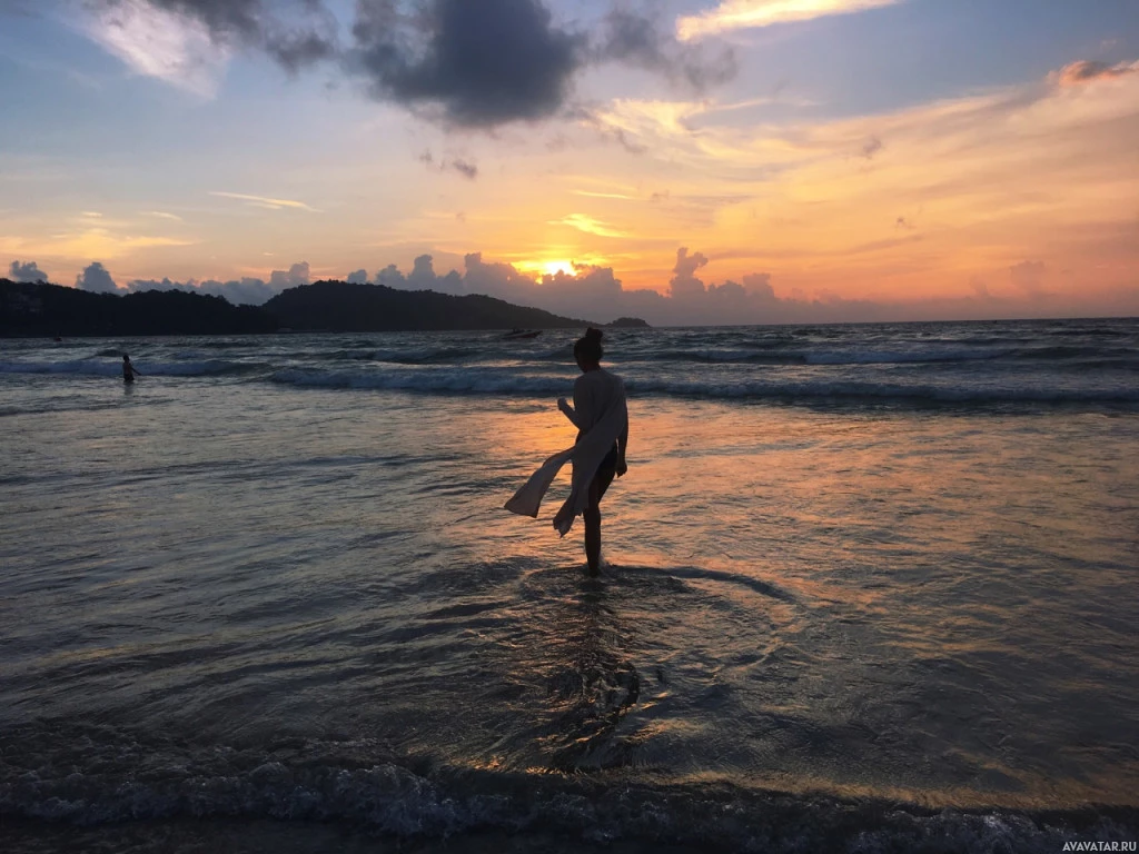 На картинке изображен силуэт человека сзади, стоящего на пляже во время заката. Небо освещено оттенками оранжевого и розового, что указывает на то, что это либо рассвет, либо сумерки. Вода кажется спокойной, отражая теплые цвета заката. Девушка на фото, кажется, наслаждается спокойным моментом наедине с морем.