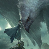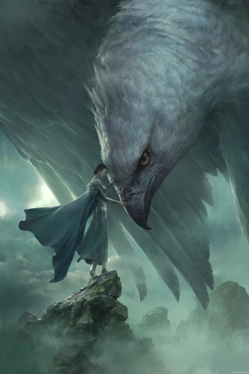 a large eagle with a menacing appearance is spreading its wings wide. The background is dark and moody, suggesting that they are in a dramatic or potentially dangerous situation. There's also what seems to be an ethereal blue figure on the left side of the image, but it's not clear whether this is another character or just part of