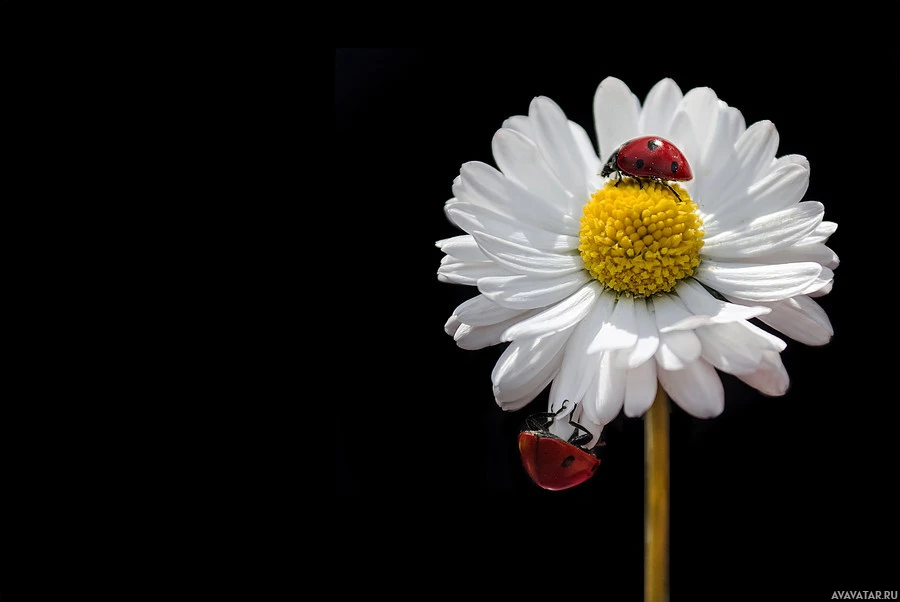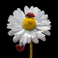 droplets of water on its petals, giving the appearance that it has been freshly rained upon. On the stem of the daisy, there is a ladybug sitting. This scene is likely captured in a way to highlight