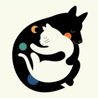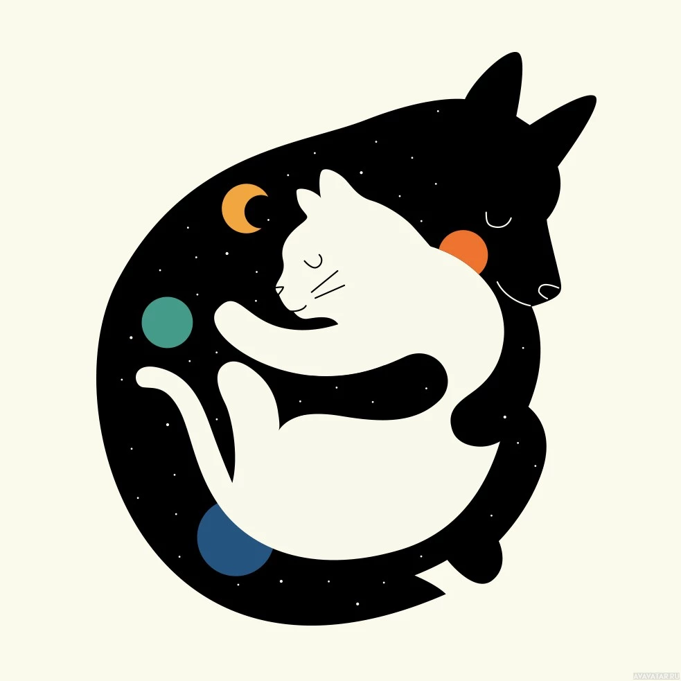 The image depicts a stylized illustration of two animals, one which appears to be a cat and the other resembling a dog. They are hugging each other in a circular embrace, surrounded by
