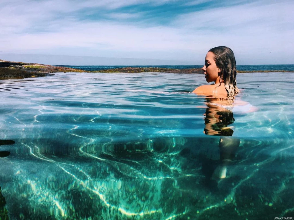 The image shows a person, specifically a woman, swimming in what appears to be a clear blue