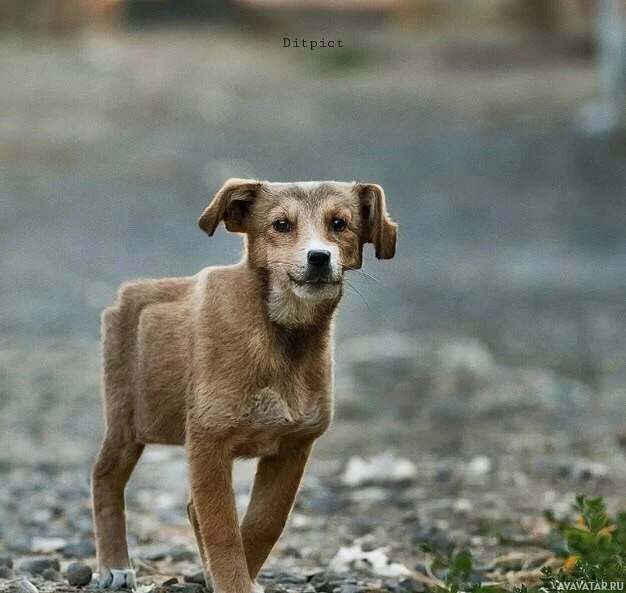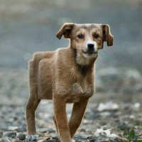 a young dog, possibly a puppy. It has a short coat that appears to be brown or tan in color, and it is standing on all fours on what looks like a gravel or