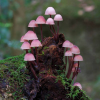 The picture shows a cluster of mushrooms growing on the trunk of a tree. The mushrooms have pink caps and are surrounded by green moss, indicating they are in a forest or woodland environment.