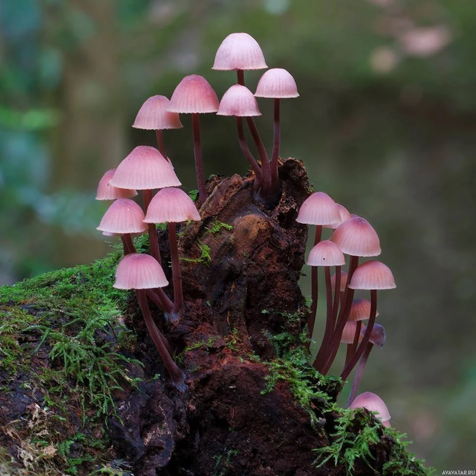 На картине видно скопление грибов, растущих на стволе дерева. Грибы имеют розовые шапки и окружены зеленым мхом, что указывает на то, что они находятся в лесу или лесной среде.