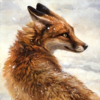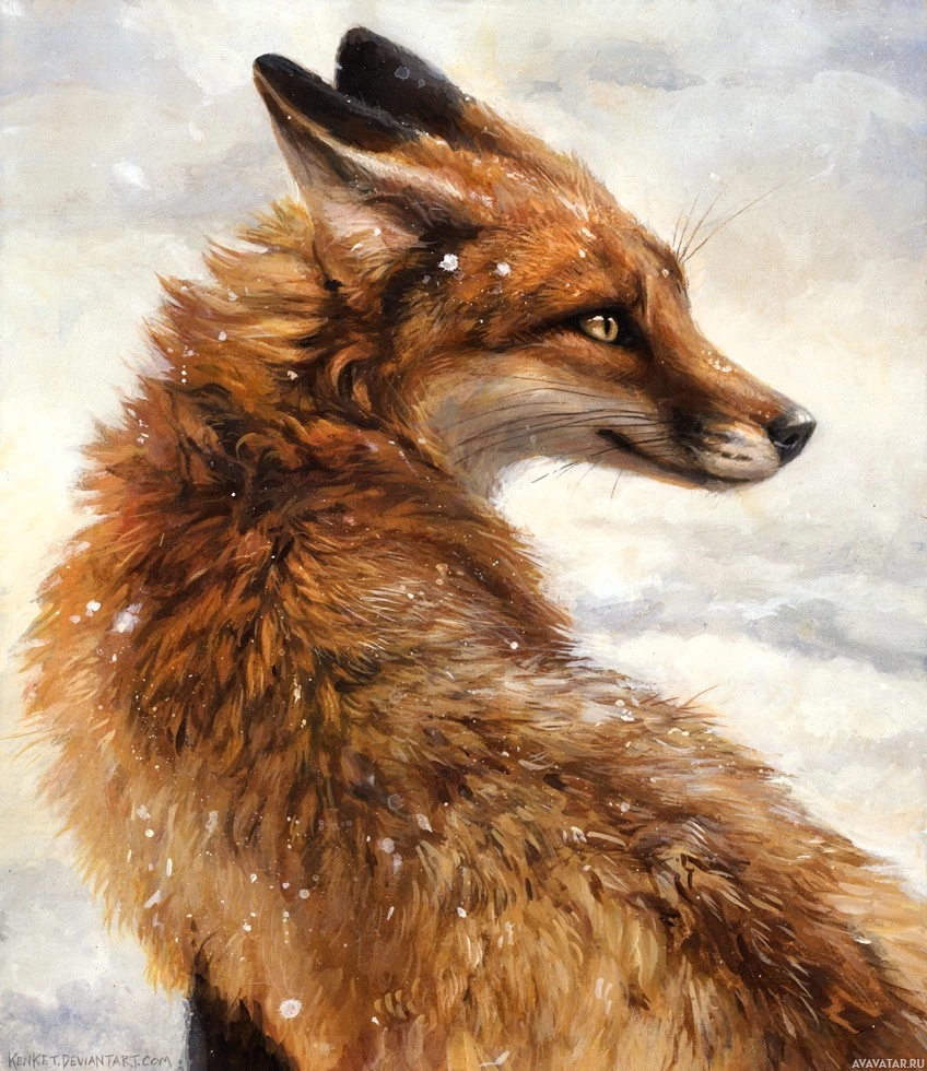 yellow eyes. The background suggests that the scene takes place in snow, which is typical for foxes'