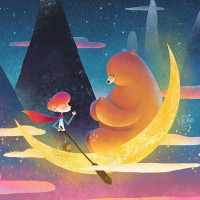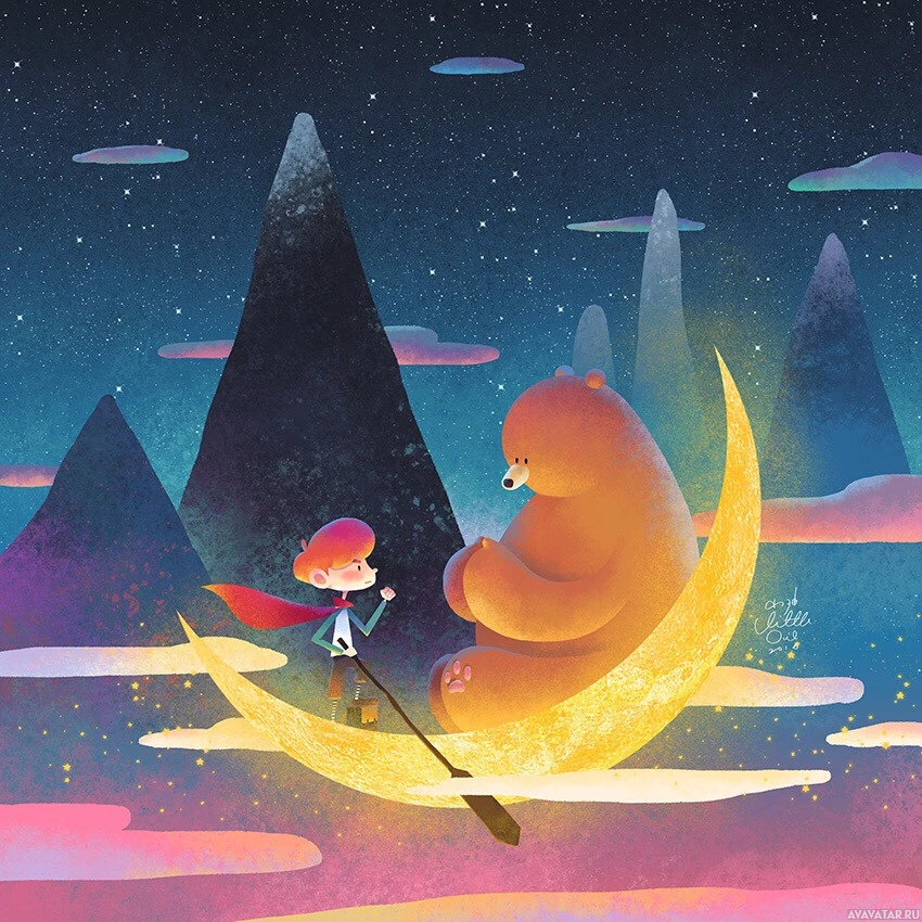 teddy bear is sitting upright on the moon and seems to be enjoying the ride, adding a sense of joy and adventure to the scene. The background depicts a dream-like landscape with dark mountains silhouetted against a starry