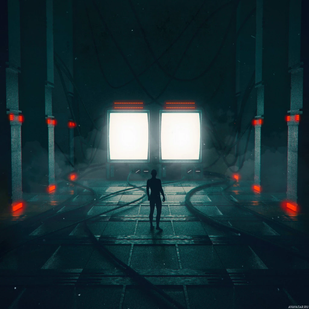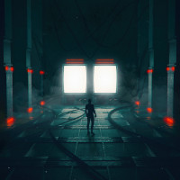 futuristic setting. There is a high-tech appearance with what looks like machinery and pipes around. The person is silhouetted against a backdrop that has glowing
