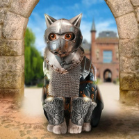 stone arches and a castle-like structure, which suggests a historical or fictional scene often associated with knights and warriors. The cat is positioned in such a way that it looks out from the archway, giving an impression of guarding or surveying the surroundings. It's a whimsical image meant to evoke amusement by combining