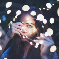 lit candles or lights. She seems to be reaching out towards the light, possibly touching one of them. It's a creative and magical-looking scene, likely meant to evoke