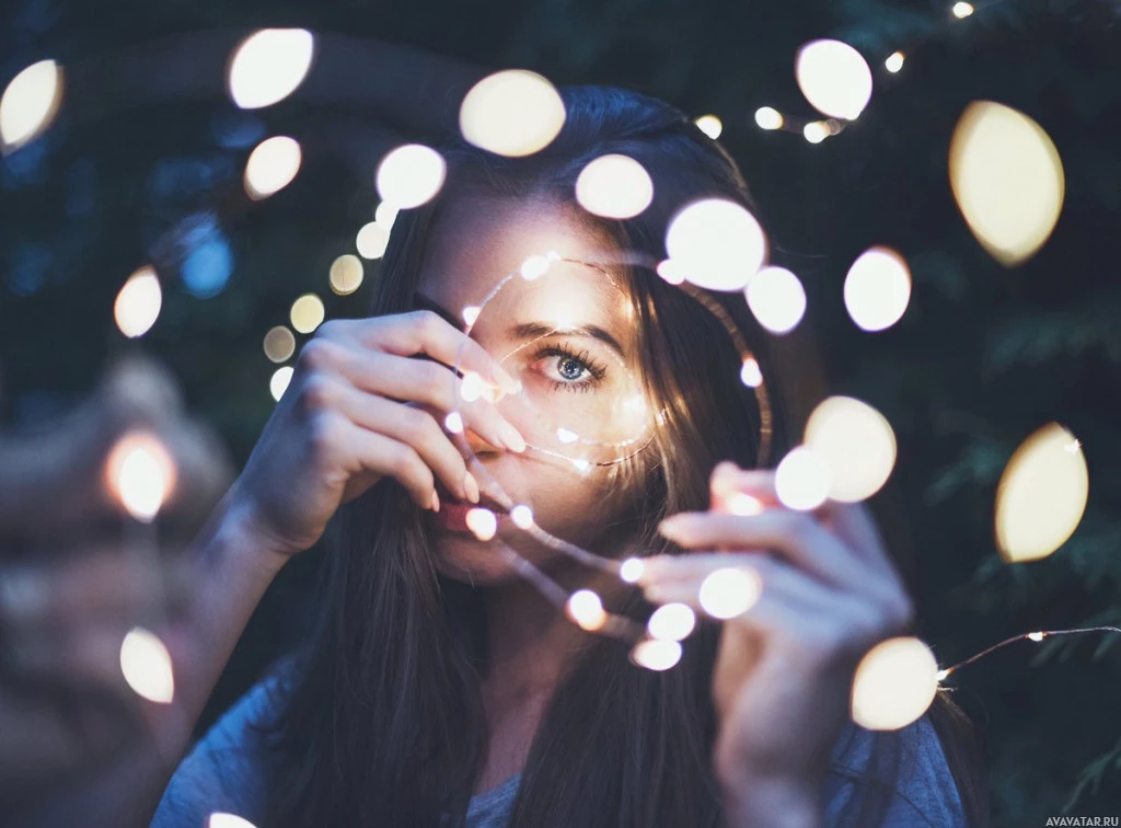 the circular arrangement of lights she is peering through, as if looking into the bulbs themselves.