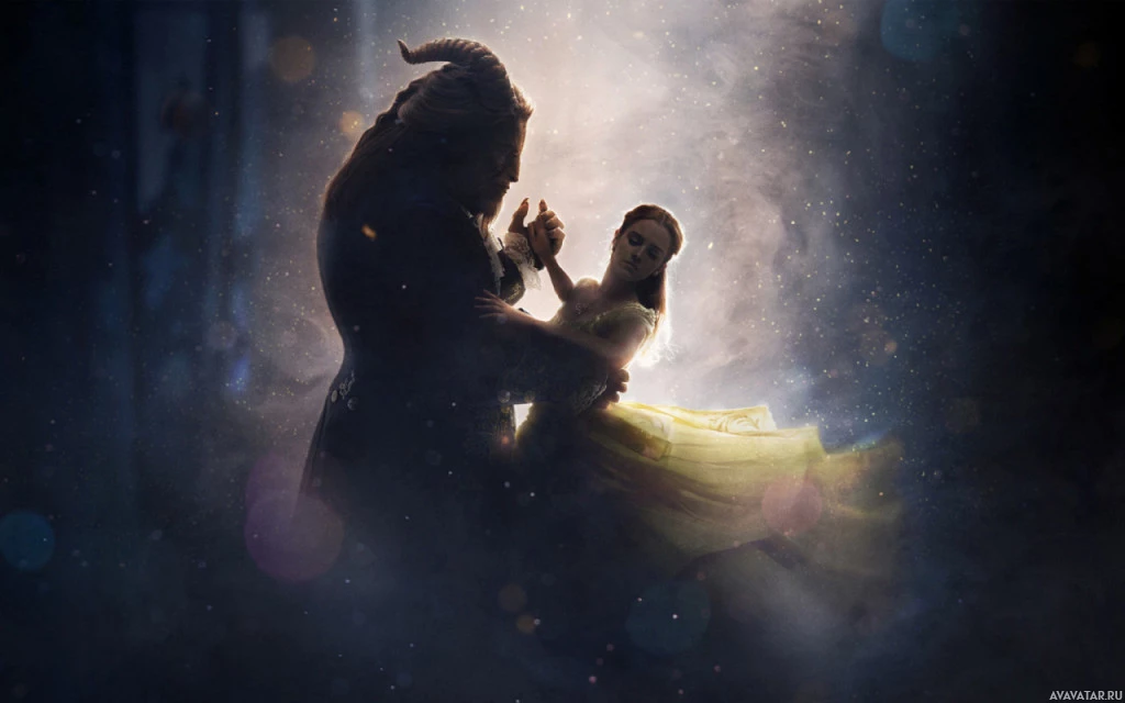 a human girl named Belle with her hands clasped together. They appear to be dancing or about to dance under a magical