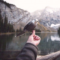 a serene landscape featuring mountains and a lake, suggesting a natural, possibly alpine setting. There are no other visible animals or text in the image.