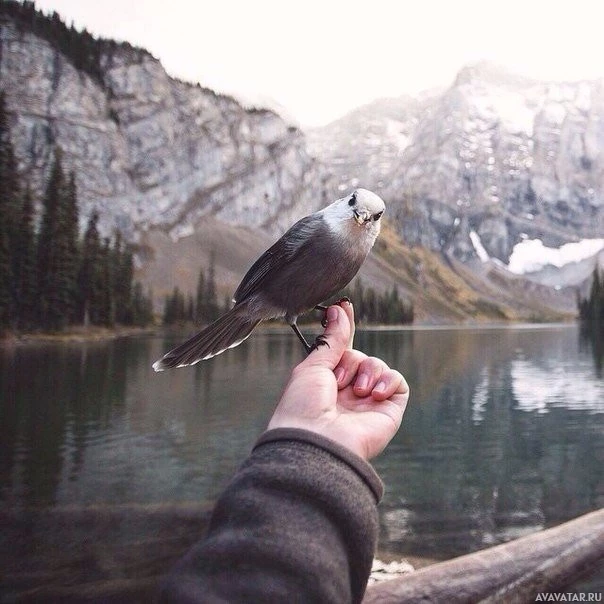 In the picture, there is a person holding out their hand towards a bird that has perched on it. The bird appears to be a small songbird with gray feathers and