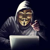 a hooded jacket and a mask resembling the "Anonymous" or "V for Vendetta" style, which is often associated with online activism and anonymity. This attire is commonly used to represent internet vigilantes or hackers, who operate under pseudonyms or anonymously. The person appears to be pointing at something on