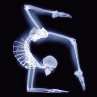 This image features a skeletal representation of a human figure performing an acrobatic pose. The bones are white, set against a black background. It appears to be a medical illustration or X-ray used for educational or informational purposes.