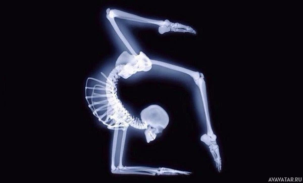 Это изображение имеет скелетное представление человеческой фигуры, выполняющей акробатическую позу. Кости белые, расположены на черном фоне. Это медицинская иллюстрация или рентген, используемый в образовательных или информационных целях.