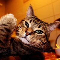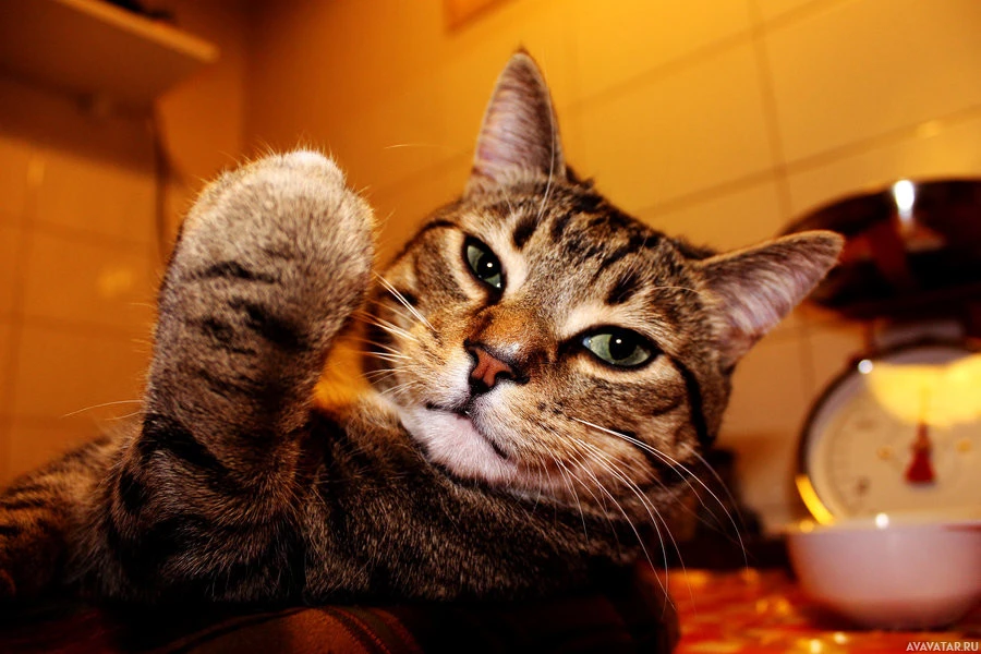 На снимке изображена кошка. Похоже, что это домашняя обстановка, возможно, в кухне или столовой, учитывая такие предметы, как чаша и шкала, видимая на заднем плане. Кошка лежит с одной поднятой лапой, словно машет. Его лицо имеет игривое выражение.