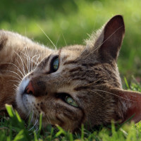 distinctive markings, possibly a tabby pattern. It is lying down with its head comfortably positioned on the ground, suggesting relaxation or perhaps even sleepiness. The cat's gaze is directed towards the camera, and its expression seems calm and content.