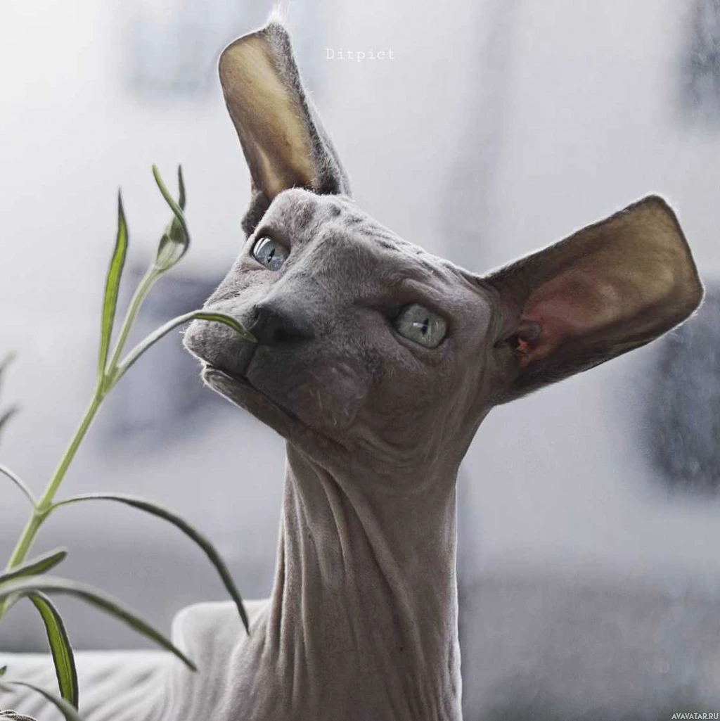 На картине изображена кошка-сфинкс, для которой характерно отсутствие меха. У кошки большие уши и характерное выражение лица, которое можно интерпретировать как удивление или любопытство. Похоже, что он находится в помещении, возможно, рядом с окном из-за присутствия растения перед ним.