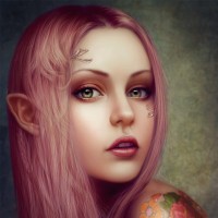 pink hair. She appears to have an elven-like appearance, which is further emphasized by the tattoo on her right arm that resembles a flower. The woman has