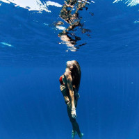 long hair that is flowing around her head due to the water's movement. The water is a deep blue color, which suggests she might be in the ocean or a very deep
