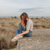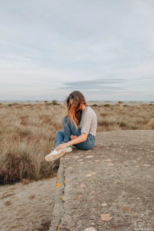 a concrete structure, possibly a wall or barrier, with their legs crossed and their head resting on one hand. This individual has long