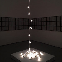 a creative display consisting of numerous small lights, which appear to be bulbs, hanging from a single string. This light sculpture is suspended in the center of the frame against