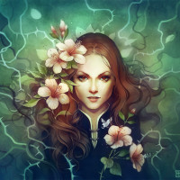 a serious expression. The artwork depicts her in profile view, with peach blossoms adorning the top right side of her head, adding a touch of