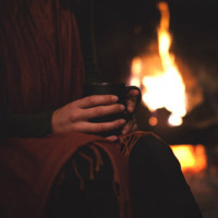 The image shows a person sitting by a fireplace. The individual is holding a mug, which could be containing hot drink, possibly tea or coffee given the context of a warm setting. The fire provides a warm ambiance to the scene.
