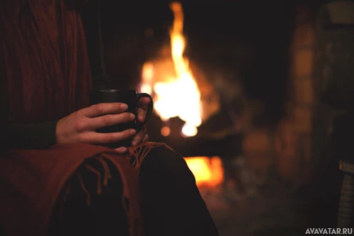 На картинке изображен человек, сидящий у камина. Человек держит кружку, которая может содержать горячий напиток, чай или кофе, учитывая контекст теплой обстановки. Огонь обеспечивает теплую атмосферу на месте происшествия.