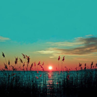 tall grasses or reeds swaying gently in what appears to be a breeze. Beyond the reeds, the sky transitions from