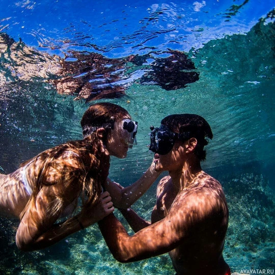 The image shows two people, a man and a woman, underwater. They appear to be wearing