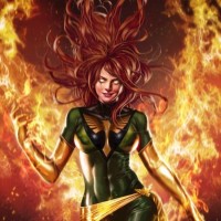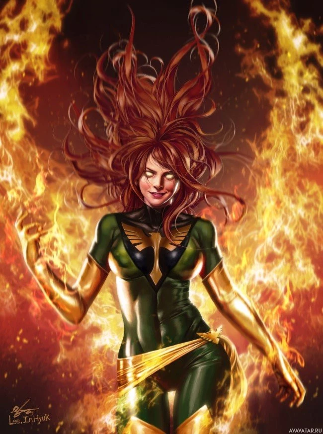 red hair styled into a wavy effect and what appears to be energy or particles around her, possibly indicating her mutant powers. Wasp is known for her ability to shrink to