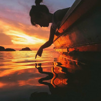 a silhouette of a person, likely a woman, sitting in what appears to be a boat on calm water. She is reaching out towards the water, possibly interacting with something floating or swimming nearby. This scene takes place during a vibrant sunset, as indicated by