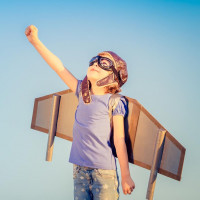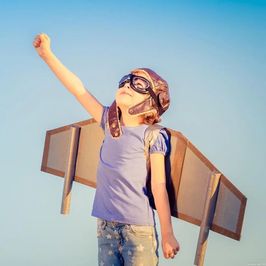 a young child wearing a pilot's costume, complete with a helmet and goggles. The child has one arm raised in the air as if reaching for something or waving to someone. Behind the child is