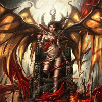 a fantasy character who appears to be a demon or some sort of mythical creature. The character is seated on a throne with flames at her feet, suggesting she might have power over fire or destruction. The character has