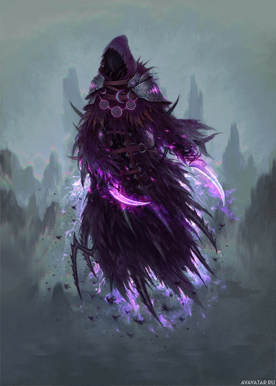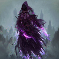 dark robe with purple and black hues, which gives off an eerie and mystical vibe. They have