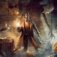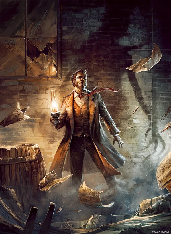 The image features a man dressed in what appears to be a detective or adventurer's costume, holding a lantern and standing amidst destruction. There are papers flying through the air around him, suggesting that he is in