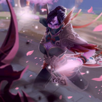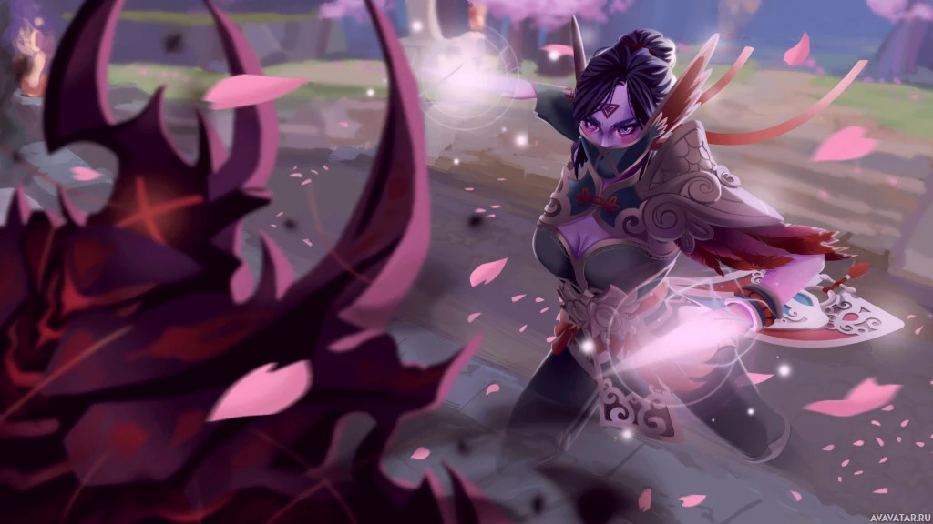 red eyes and dark skin. The background suggests a magical battlefield with fallen cherry blossom petals floating in the air, adding to