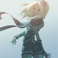 blonde hair and is wearing what appears to be a blue outfit with some details that suggest a fantasy or action-oriented setting, such as shoulder armor or straps on her arms. There is a scarf or fabric draped over her shoulders and tied at the waist. The background is somewhat blurred but has a soft, warm color palette, which might indicate