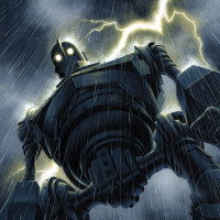 a dramatic setting. The robot, which appears to be a mechanical creation with a humanoid shape, is shown against the backdrop of a tumultuous sky filled with