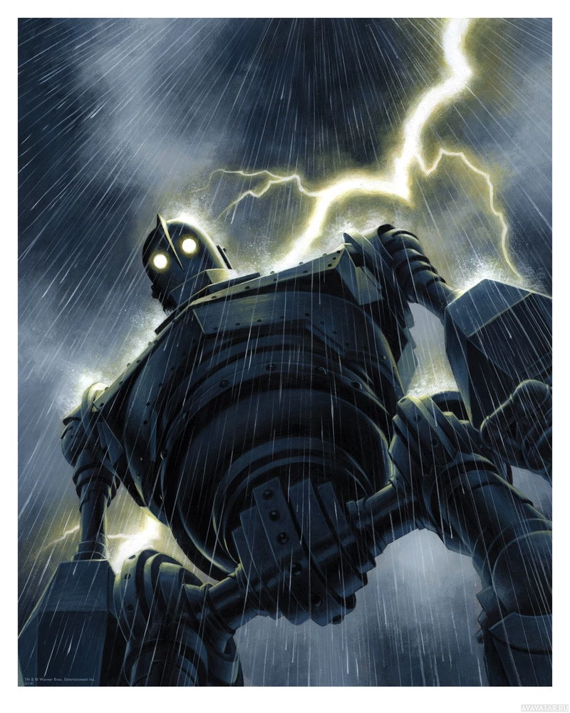 dark clouds and lightning bolts striking the ground. The robot has