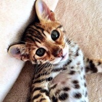 На снимке изображен молодой бенгальский котенок, характеризующийся своим отличительным рисунком пальто из темных отметин на светлом фоне. У него большие голубые глаза и любопытное выражение.