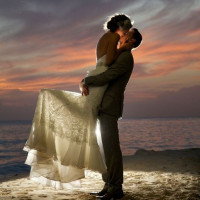 wedding day. They are standing on the beach during what appears to be either sunrise or sunset, given