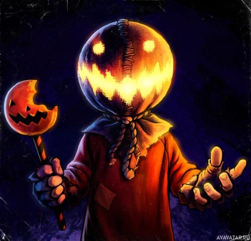 an animated character dressed as a jack-o'-lantern, which is a common Halloween motif. The character has a classic pumpkin shape with a carved face that includes two